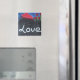 Original pintura al óleo de la artista Susan Payne-Trutna de un Heart Garden lleno de flores de corazón de chocolate y una caja de chocolate con forma de corazón. La obra de arte original también contiene un AMOR pintado a mano. Este imán encantador es un San Valentín perfecto.