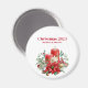 Un imán con un ramo de bonito hecho con acuarelas. velas rojas con acentos dorados y una vela blanca más pequeña también. Rodeado por un ramo de pino con una flor de poinsettia.