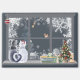 Una imagen de bonito con dos gatos gatitos mirando por una ventana dolorosa a enormes copos de nieve con un árbol de Navidad y regalos de vacaciones y adorno decorando la ventana. Un pájaro amarillo se sienta en el panel medio mirando la calidez de las vacaciones