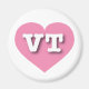 Este imán tiene un corazón fresco y rosa que contiene las letras atrevidas, blancas y altas del funda VT, la abreviatura oficial de Vermont, el estado montañoso verde.