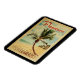 Un diseño artístico Flamenco Puerto Rico de mediados de siglo único y retro, con un estilo poster de viajes vintage. Cuenta con una palmera curvada en una playa de arena con el océano bajo un cielo azul turbio.