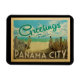 El diseño de esta postal antigua de Greetings From Panama City incluye una playa de arena con un hermoso agua turquesa del océano y sobre el mar, un cielo azul con nubes blancas onduladas. En estilo de viajes vintage.