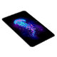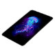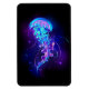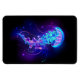 Gran medusa azul, de dibujo artístico, brillante y brillante, con largos tentáculos sobre fondo negro con bioluminiscencia violeta. Luminosas medusas.