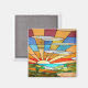 Imán cuadrado con una imagen de vidrio coloreado Art Déco; un paisaje de colinas onduladas, un lago o océano, árboles y un sol naciente. Vea la colección completa de Roaring 20s Magnet en los TOUCHES ESPECIALES | Sección de favoritos de partido.