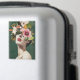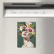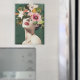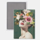 Una fascinante obra de arte digital de una mujer con flores y exuberante vegetación adorna su rostro, oscureciendo sus ojos y creando una sensación de misterio y conexión con la naturaleza. Sus suaves y estilizadas características contrastan con las vibrantes flores y follaje, mientras que el rico fondo verde resalta la belleza de su corona floral. La composición mezcla surrealismo y elegancia, encarnando una armonía entre la forma humana y la naturaleza.