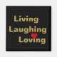 Inspirador imán negro y oro "Vivir, reír y amar". El cliente puede cambiar el color de fondo negro. El corazón rojo está frente al corazón dorado. Se puede elegir el que se debe conservar en el diseño. Por celeste@khoncepts.com