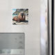 Walrus themed magnet with a cute walrus laying on a sandy beach by the ocean on a sunny day. Background of cliffs and blue ocean waves.