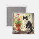 An illustration of a black and white cat sitting on a flower filled window sill illustration magnet for those that love their tuxedo cats.