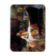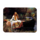 John William Waterhouse El imán Lady de Shalott. Óleo sobre lienzo de 1888. La Dama de Shalott es una bella pintura pre-Raphaelite de una escena del poema del mismo nombre de Alfred Lord Tennyson. El cuadro representa a la Señora de Shalott condenada al fracaso y que navega hacia Camelot en un pequeño barco adornado con un hermoso tapiz rojo que ella ondeó mientras se enamoraba de Lancelot. En el bote se sientan tres velas y un crucifijo del que el chica mira lejos. La señora misma está vestida con un vestido medieval azul claro que fluye bordeado de oro. Su pelo es ardor ligero y ella sostiene la cadena del bote mientras se presiona lejos del muelle hacia las cañas y las almohadillas de lirio más allá. Un gran regalo para los fanáticos de John William Waterhouse, las pre-raphaelitas, la pintura romántica inglesa y la leyenda artruriana.