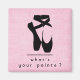 Text says "what's your pointe?". An illustration of a pair of black ballet shoes / slippers standing in the classical and contemporary ballet dancers pose up on the tips of their toes, known as en pointe. Background is pink with little white polka dots.