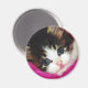Fotografía a todo color de un gatito calico con ojos azules enormes y con un fondo rosa rico. Perfecto para los amantes de los gatos o de los animales. ¡Irresable!