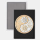 A yin yang symbol is adorned with intricate floral patterns and leaves. The design features a harmonious blend of gold and silver colors.