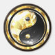 Joyería, oro y símbolo yin yang negro sobre fondo negro. Oro yin yang.