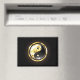 Joyería, oro y símbolo yin yang negro sobre fondo negro. Oro yin yang.