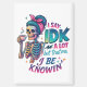 Diseño vibrante y colorido con esqueleto femenino tomando café. El colorido texto dice: "Digo IDK mucho pero confíe en mí, sé saber". Este diseño está disponible en una amplia variedad de productos.