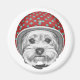 Este diseño presenta un retrato de un Terrier de Yorkshire con un casco de polka verde azulado y rojo punteado.