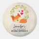 Imán de salvado de fecha de cumpleaños con un fondo color crema con formas geométricas tenues de moda. Superpuesto en la parte superior hay un dibujo animado de un zorro naranja lindo durmiendo pacíficamente. Una corona de hojas verdes con 3 pequeños corazones rojos detrás.
