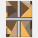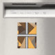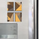 Imanes redondos, cuadrados y rectangulares con barras. Barred es un diseño abstracto creado por Anna M. Asbury y consiste en formas marrones, naranjas, beige y grises detrás de barras de gradiente plateado.