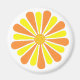 La pintura de pétalos amarillos y naranjas brillantes que salen de círculos amarillos y naranjas, está impresa en los imanes. Parece una flor o una explosión energética.