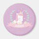 Un imán para el pequeño personalizado con su nombre. Tiene un lindo unicornio blanco con mágicas chispas alrededor de su cuerno. Flores y flores como elementos decorativos.