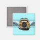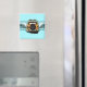 Una leña vintage equipada con un par de longboard, encuentra la onda de ruptura doble perfecta. La ola ilustrada tiene una imagen fantasma de una huella de hibisco pareau. La placa de la antigua licencia de California dice Beachin'. Este imán de surf se encuentra en varios colores.
