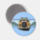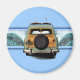 Una leña vintage equipada con un par de longboard, encuentra la onda de ruptura doble perfecta. La ola ilustrada tiene una imagen fantasma de una huella de hibisco pareau. La placa de la antigua licencia de California dice Beachin'. Este imán de surf se encuentra en varios colores.