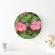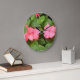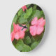 Este impresionante reloj muestra una fotografía de dos flores de impatizantes rosas bonitos y la follaje circundante. Los pétalos brillan y las hojas se mojan de una tormenta.