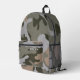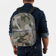 Mochila con diseño de patrones de camuflaje. Los colores son verde del ejército, verde del bosque oscuro, gris claro y bronceado. Incluya un nombre, en una fuente gris, con problemas de tensión, en el bolsillo de la cremallera o elimine el texto de ejemplo.