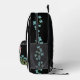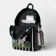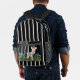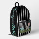 Aquí hay un diseño divertido que presenta un patrón rayado en blanco y negro. En la bolsa con cremallera hay una cebra adorable, con gafas rosas y un arco rosado. A lo largo de los lados y el fondo de la mochila, hay un borde de flores azules.