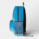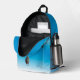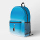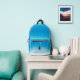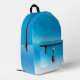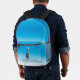 Pelican parado en el bolsillo trasero. El resto de la bolsa representa un cielo azul claro.