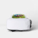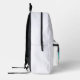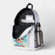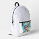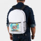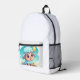 Una mochila blanca y limpia con un bolsillo delantero con un encantador ilustracion de un bonito cordero personalizado. El cordero tiene lana azul suave y esponjosa y ojos grandes y violetas. Se encuentra en un campo animado y soleado con flores amarillas y un sol amarillo brillante mirando desde la parte superior derecha. El diseño general es original y perfecto para los niños, ya que combina un objeto práctico con un diseño encantador y amigable para los niños