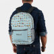 Diseño colorido con iconos relacionados con la escuela. Ideal para los niños que empiezan la escuela para entusiasmarlos con el aprendizaje. Los iconos incluyen mochilas, libros, frascos Erlenmeyer, lápices, lápices, lápices, globo, tijeras, autobuses y microscopios. Fondo azul. Personalice el bolsillo delantero con el nombre del niño.
