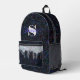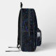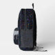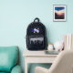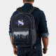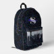 La mochila impresa de este personalizado presenta un fondo purpurina de arco iris de regaliz negro, con purpurina plateado iridiscente holográfico goteando desde el bolsillo de la cremallera frontal, La plantilla permite una fácil personalización, incluyendo un gran monograma inicial y / o un nombre completo en un tipo de letra de guión de caligrafía morada neón. Cualquiera de los dos se puede eliminar fácilmente dejando el cuadro de texto personalizado en blanco.