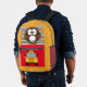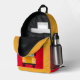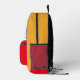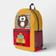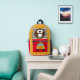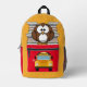 Esta mochila amarilla y roja brillante tiene un búho encaramado sobre la bolsa de cierre. Detrás del búho hay pilas de libros. En la bolsa de cierre rojo hay una imagen de un autobús escolar, con un área para el nombre de su hijo.