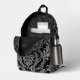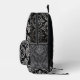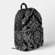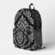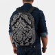 Una sofisticada mochila negra adornada con un intrincado y elegante patrón de damasco plateado, perfecto para añadir un toque de estilo clásico a tu carga diaria.