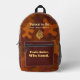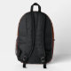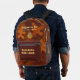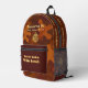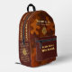 Mochila silenciosa del tren VTVB mostrada en el diseño de camuflaje naranja y marrón: muestra nuestro símbolo distintivo, La espiral de Becoming, y su significado en los paneles de la izquierda y la derecha Alentamiento: Tren tranquilo. Ganar En Voz Alta.