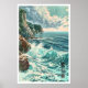 Impresión artística de la costa japonesa olas del océano azul, acantilados rocosos