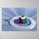 Una imagen en 3D creada en Vue, llena de reflejos y luces brillando desde todas direcciones. Cinco esferas de colores de vidrio azul, rosa, turquesa, naranja y diamante se asientan en una pirámide rodeada por un anillo blanco translúcido. Se sientan sobre un fondo alucinante de rayos azul y blanco pálidos que convergen justo debajo de las cinco bolas de cristal.