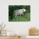 Esta hermosa imagen muestra una fotografía de una bonita oveja esponjosa. La oveja está rodeada de flores silvestres y de hierba larga y está comiendo algunas hojas. Tiene un grueso abrigo blanco de lana y una nariz negra linda.