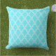 Esta almohada de acento al aire libre se muestra con un bonito diseño de impresión turquesa y marroquí blanca. Personalizar este artículo o compra tal cual. Imagen de stock