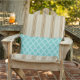 Esta almohada de acento al aire libre se muestra con un bonito diseño de huellas marroquíes de Aqua y White. Personalizar este artículo o compra tal cual. Imagen de stock