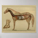 Ilustracion de época. Vista lateral del caballo mostrando la columna vertebral y los órganos internos. Corazón, pulmones, estómago e intestinos. Con un cierre de la pezuña.