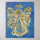 Pintura de un ángel blanco y dorado sobre un fondo azul suave.