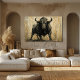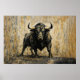 Una audaz huella de acuarela acrílica de un potente toro negro parado en su suelo, pintado en cálidos tonos dorados. Pieza de exposición perfecta para salones, oficinas o decoración de inspiración occidental.