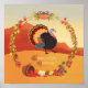 Un pájaro de pavo colorido muestra su penacho. Hojas de otoño y una abundante cosecha adornan la escena.