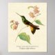 Ilustracion de historia natural vintage por Antoine-Germain Bevalet, c. 1874, de la Starfrontlet de Liguera Violeta (Coeligena violifer dichroura). Un colibrí verde con un parche de garganta morada y una cola dorada se perfila en una planta tropical de wigandia con flores rosas, con un fondo de textura amarillo claro de pergamino. Limpiado y mejorado digitalmente, conservando sus características vintage. Presenta nombres comunes y científicos en fuentes decorativas. Tamaño para ajustar el marco estándar.