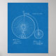1885 ilustracion de diseño técnico con patente estadounidense para bicicletas de avanzada Vintage o Penny. Conducción del pedal con ruedas de apoyo laterales. Fondo del papel de impresión azul. Más impresiones de patentes en nuestra sección "Impresiones de patentes estadounidenses". Posters de publicidad en bicicleta bajo nuestra sección "Anuncios de publicidad en época de vacas"