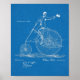 1883 ilustracion de diseño técnico con patente estadounidense para bicicletas de avanzada Vintage o Penny. Palanca propulsada por un caballero saludando. Fondo del papel de impresión azul. Más impresiones de patentes en nuestra sección "Impresiones de patentes estadounidenses". Posters de publicidad en bicicleta bajo nuestra sección "Anuncios de publicidad en época de vacas"