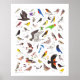 Esbozos de pájaros pintados a mano que viven en la bahía de San Francisco, desde siskins de pino hasta halcones peregrinos, con plumas lapiceras dispersas sobre un fondo blanco.