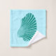 Toalla colocada en un plano de impresión en bloque, a base de una concha de vieiras, de color turquesa sobre un fondo acuático pastel